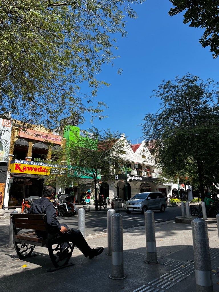 Malioboro has changed recently, before there were lots of vendors selling on the sidewalks but now it’s not allowed. They can sell souvenirs and food in a large area called Teras Malioboro. The old Malioboro street was narrow and dirty, but now it looks so large, neat and clean because there are more spaces for pedestrians to enjoy the street.